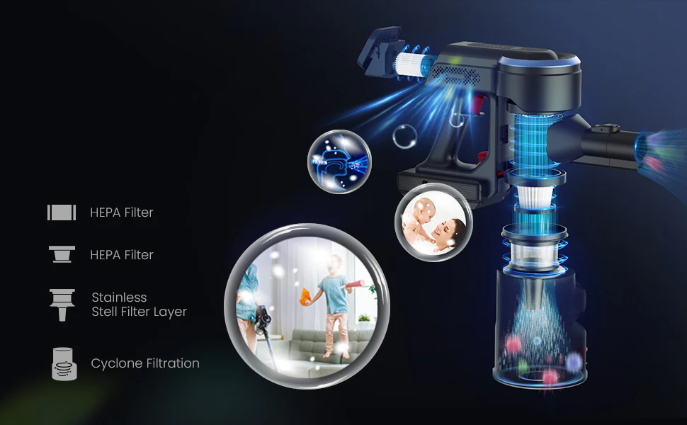 Discover hidden dirt and dust with our vacuum cleaner’s dust-detecting LED lights. Perfect for dark corners, under furniture, and low-light areas, this feature guarantees a thorough and satisfying clean every time.
